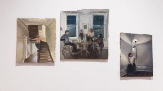 'Housewarming' 2025. Oil on board; 3 paintings: 33 x 38cm, 40 x 43cm, 27 x 36cm.