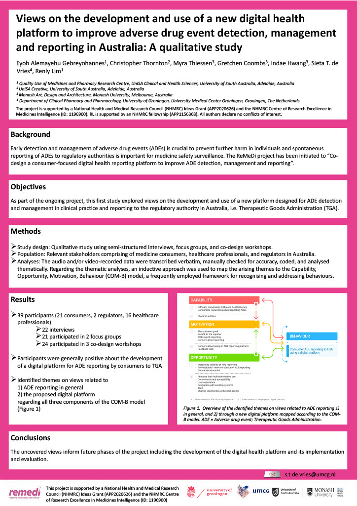 Medicines have many benefits but can also cause harm; these harms are called adverse drug events (ADEs). ADEs are common and often lead to patient harm. In Australia, we estimate that 1.2 million people experienced an ADE within a six-month period. Currently pharmacovigilance processes require voluntary ADE reports to regulatory authorities. These reports are then investigated to identify new medical safety issues. Despite the need, there is no proactive system in Australia that helps to enable consumers and health professionals to detect and manage ADEs, nor a mechanism for consumers to report ADEs that is easy-to-use, intuitive and engages them. This project aims to co-design a digital health platform to enable consumers and health professionals to actively detect medicine harms, and for consumers to report the harms to the medicine regulatory authority in Australia.