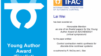 Lai Wei was awarded an Honorable Mention as one of the finalists for the Young Author Award at the 11th IFAC International Symposium on Advanced Control of Chemical Processes (ADCHEM 2021)