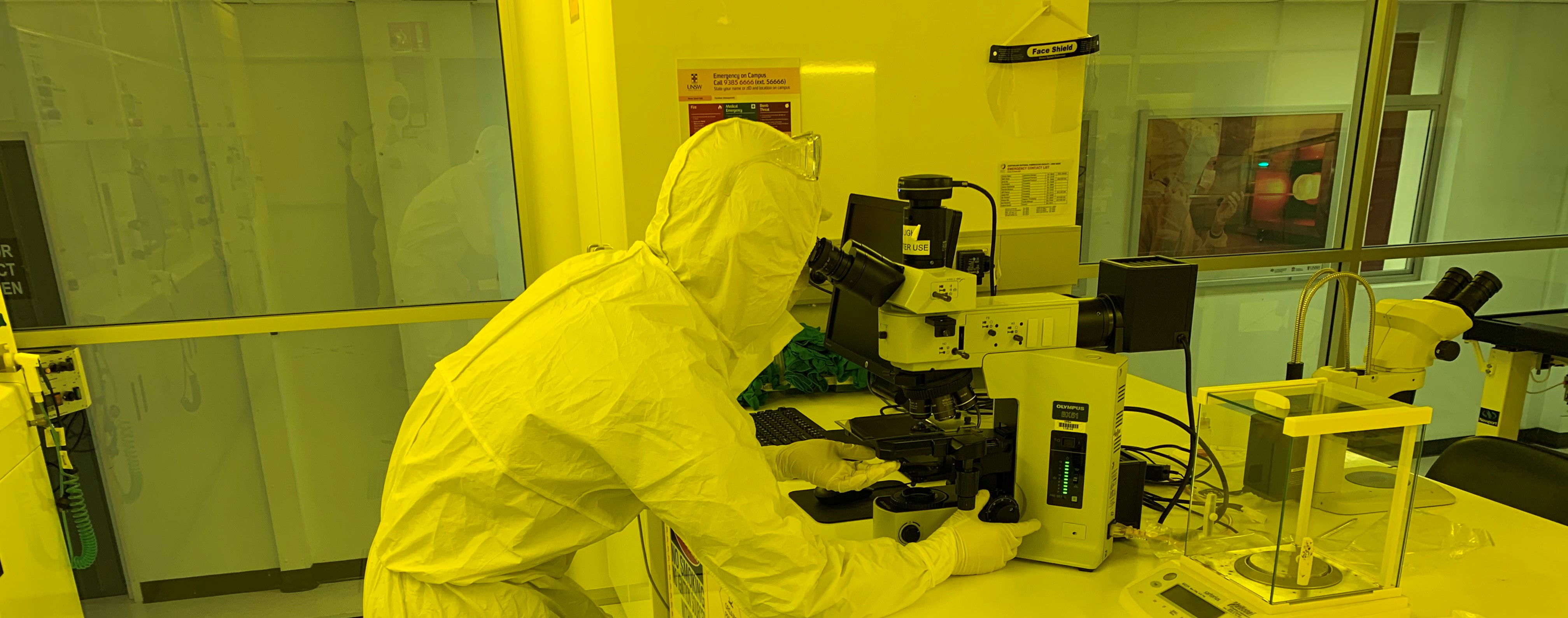At ANFF, the cleanroom I work in is completely free of dust and UV light, which protects the samples from any environmental defects that may arise. To ensure this room stays “clean” I wear protective equipment from head to toe so that the particles and dust gathered on my skin don’t contaminate the room or the sample. As a bonus, the outfit makes me feel like I am from one of those movies where you see people in a hazmat suit, saving the world from some sort of zombie apocalypse.