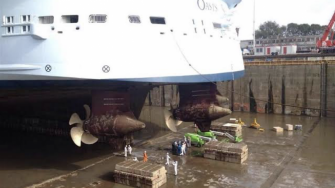 Azimuth and bow thrusters, essentially massive propellers, are fitted to the hull of these vessels to enable the ships to manoeuvre themselves in tight quarters.