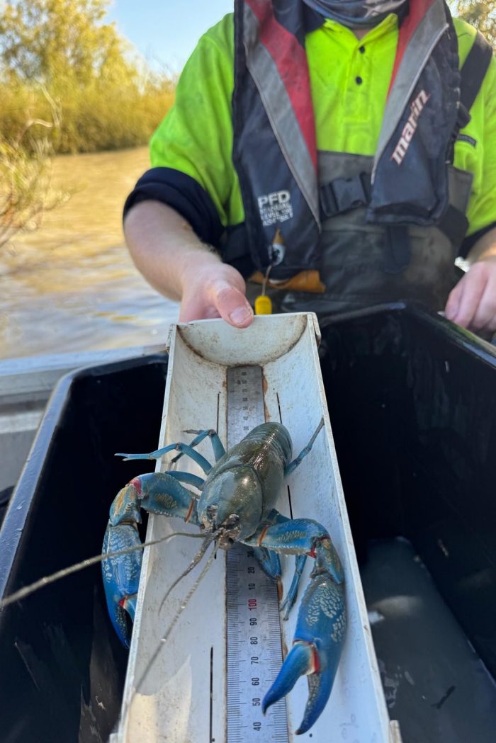 Narran Lakes’ Clear Lake - The length of a common yabby (Cherax destructor destructor) is being measured. Large numbers were encountered in the Narran River around Narran Park.