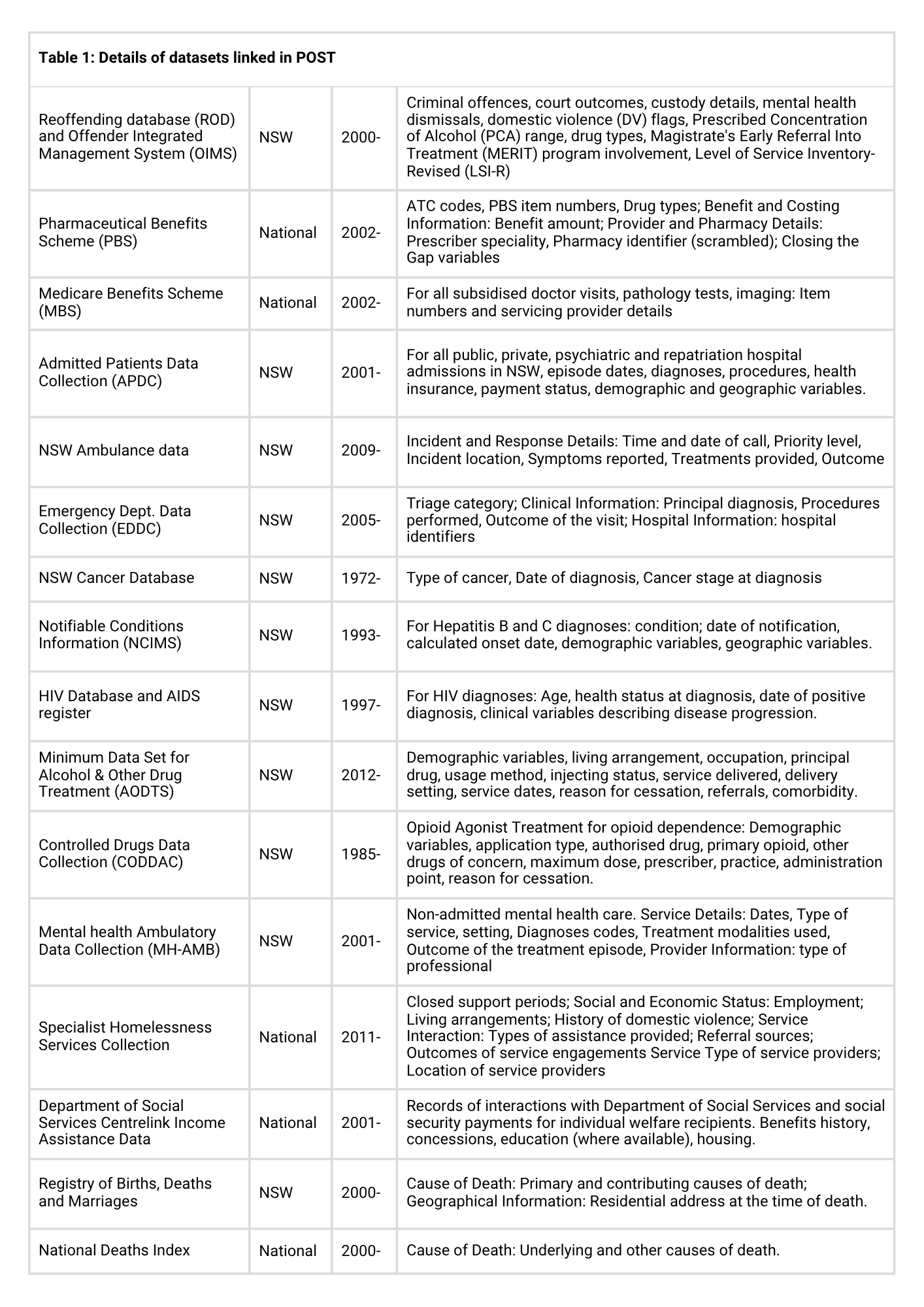 POST has all required ethics approvals: NSW Population and Health Services Ethics Committee (No: 2022/ETH00289), Australian Institute of Health and Welfare (No: EO2022/5/1371), Corrections Health (No: 2021.61), Aboriginal Health and Medical Research Council Ethics Committee (No: 1999/22), and UNSW Sydney Human Research Ethics Committee (No: iRECS6272). A waiver of consent has been granted through ethics approval.