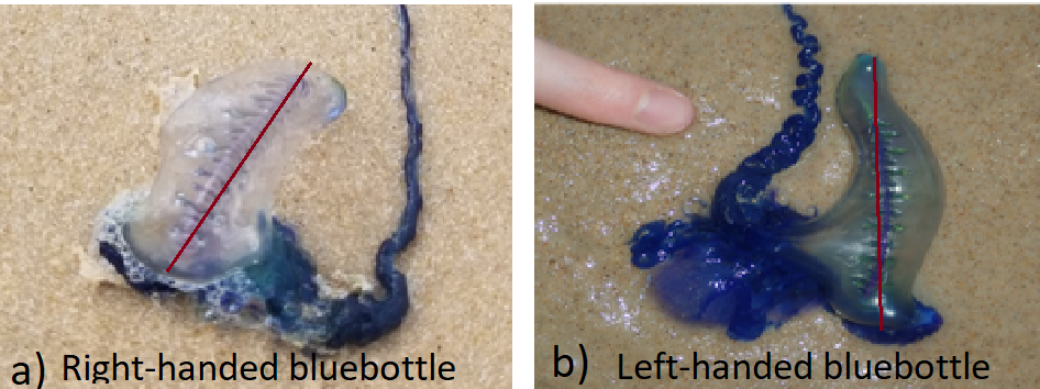 Is it right or left-handed? When pointing forward, away from you, with the float at the top, the dark blue bulge of the tentacles is to the right of the float for right-handed bluebottles, or to the left of the float for left-handed bluebottles.